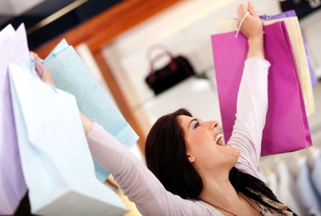 Very happy shopping woman with arms up holding bags