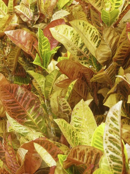 Vibrant tropical colors of Croton petra (botanical name: Codiaeum variegatum 'Petra'), often grown as a house plant and in conservatories, shown here as an outdoor shrub in Honolulu