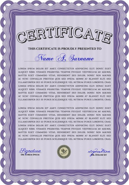 Violet Diploma or certificate template. Vector illustration. With complex background. Lovely design.