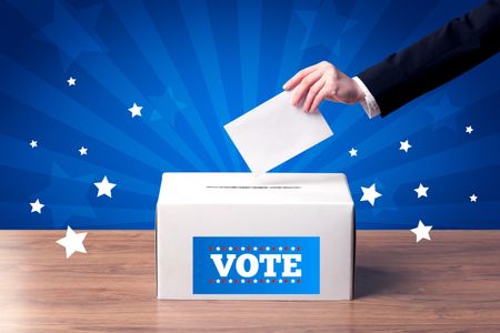 Voting hand with ballot and wooden box