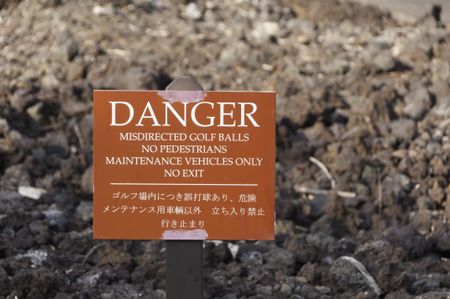 Warning sign in English and Japanese posted in lava field on golf course in Hawaii