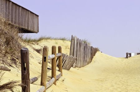 Way to the beach: Public access by wooden fences and corner of house deck overlooking the ocean