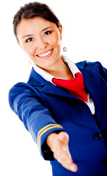 Welcoming air hostess with hand extended �¢?? isolated over a white background