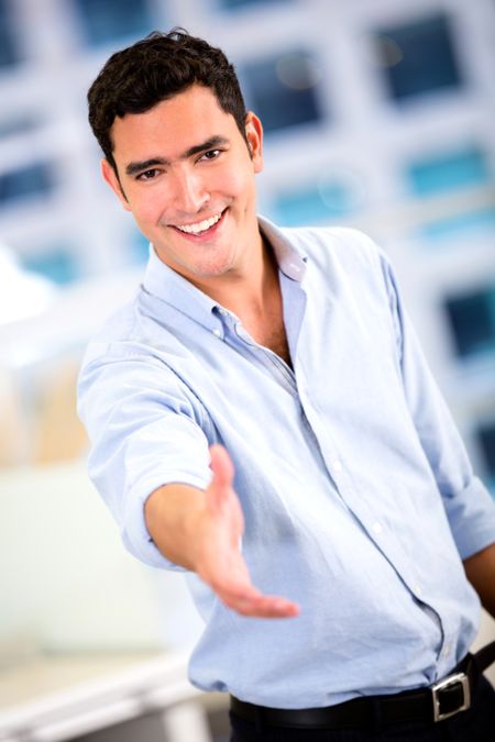 Welcoming business man with hand extended to handshake
