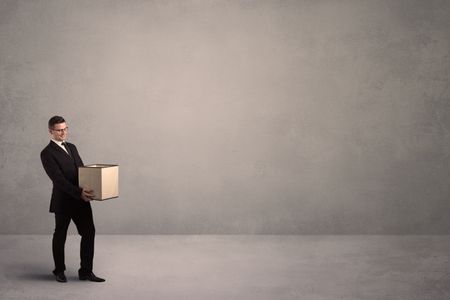A well dressed young office worker holding an empty paper box with clear concrete wall background concept.