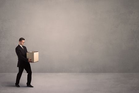 A well dressed young office worker holding an empty paper box with clear concrete wall background concept.