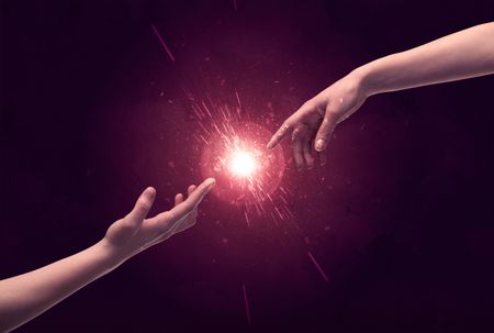 White caucasian male hands reaching out with fingers almost touching in bright red light sparkle in empty space background concept