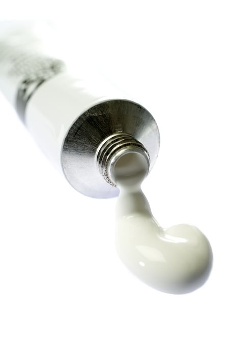 White paint coming from tube on white background