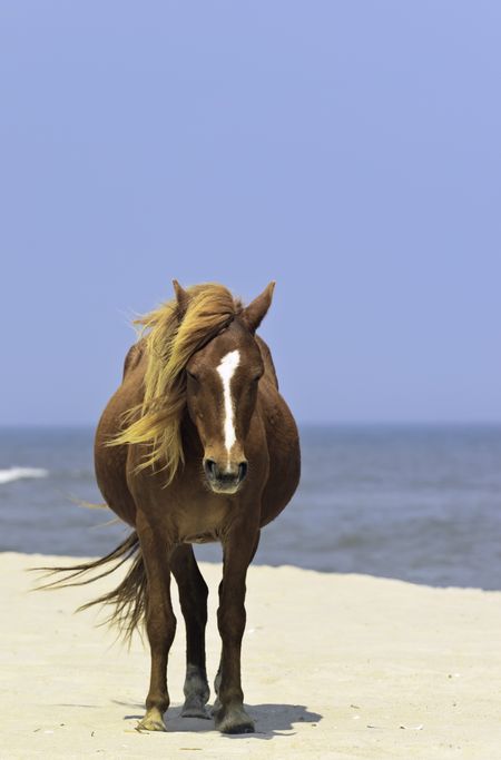 Wild horse standing alone on breezy beach of Assateague Island, Maryland