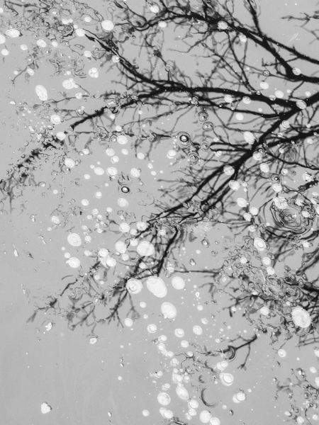 Winter at a glance: Illustration of bare tree reflected by icy surface of stream with frozen bubbles, in black and white