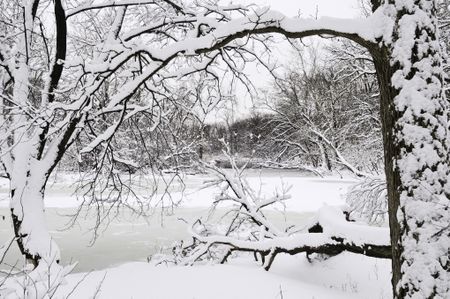 Winter at a glance: River with snow and ice framed by trees in foreground after a blizzard early in March, Oak Brook, Illinois