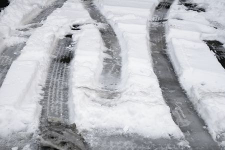 Winter at a glance: tire tracks in snow on parking spaces