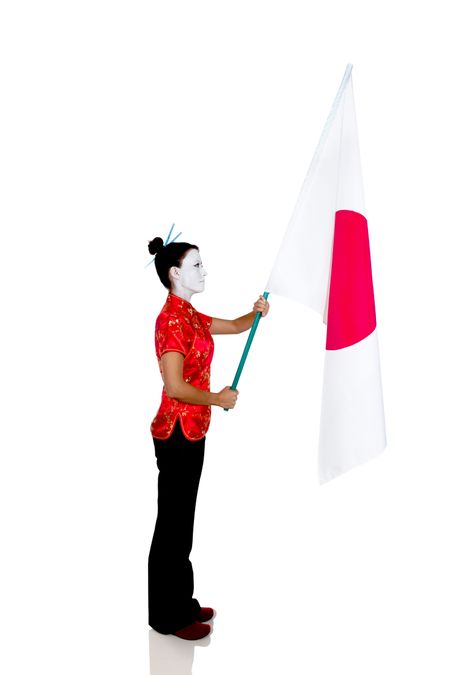 Woman in Asian outfit holding Japan's flag - isolated