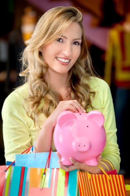 Woman with bags and a piggybank smiling