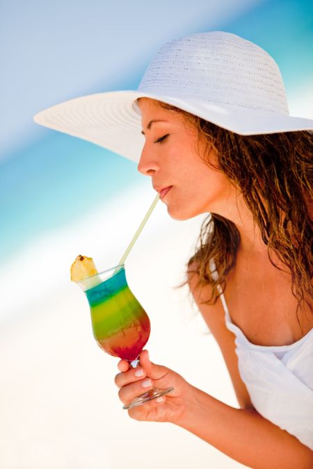 Woman at the beach drinking a refreshing beverage