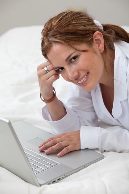 Woman in bed working on a laptop computer