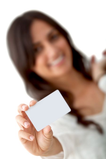 woman with a business card isolated over a white background