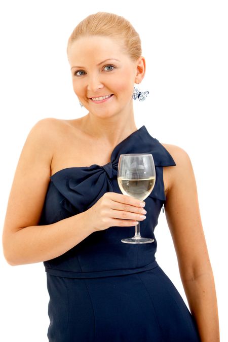Woman in a cocktail dress with a wineglass isolated over a white background
