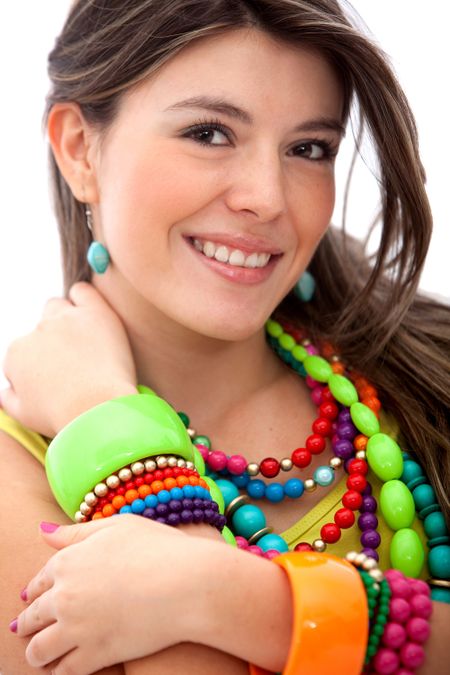 Woman with colorful jewelry smiling - isolated over a white background