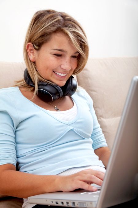 Woman on the computer with headphones at home