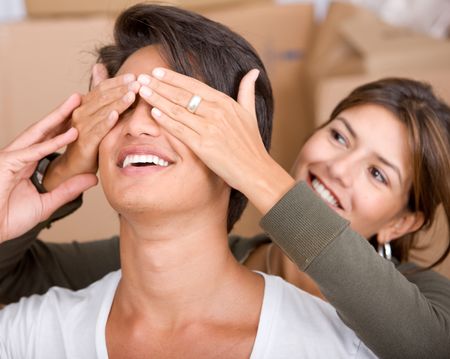 Woman covering the eyes of her removal partner
