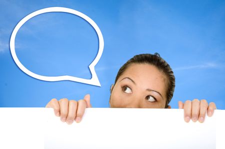 Woman covering her face with a banner and thinking