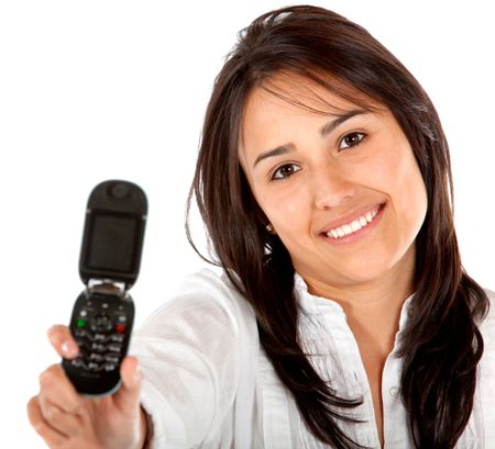 Woman displaying a cell phone isolated over a white background