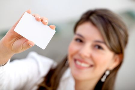 Woman displaying a personal business card at the office