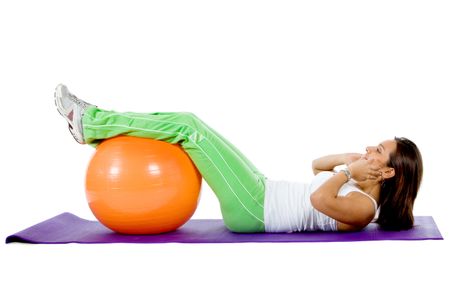 Woman doing abdominals with a pilates ball isolated on white