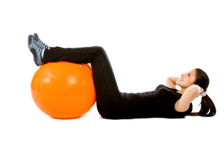 Woman doing exercises for her abs with a pilates ball - isolated over white