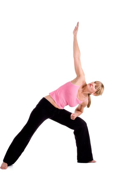 Woman doing yoga on white background