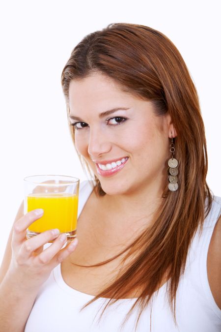 Woman drinking orange juice isolated over a white background