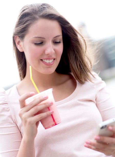 Woman enjoying a milkshake and texting on her phone