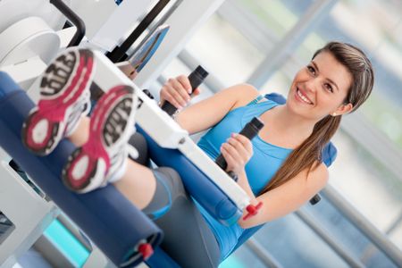 Woman exercising her arms and back at the gym on a machine