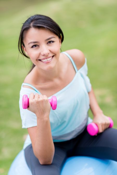 Woman exercising outdoors with a Pilates ball