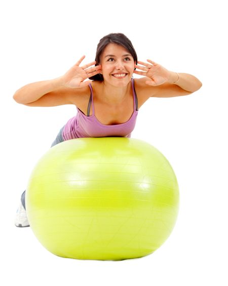 Woman exercising with a pilates ball isolated over a white background