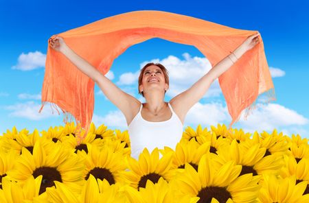 Woman in a field of beautiful yellow sunflowers with a blue sky on the background