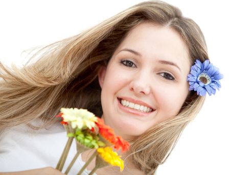 Woman with flowers on her head isolated over white