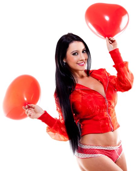 Woman giving a surprise on Valentines day - isolated over a white background