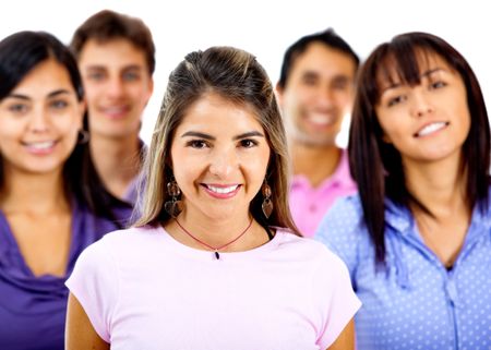 Woman with a group looking happy - isolated over a white background
