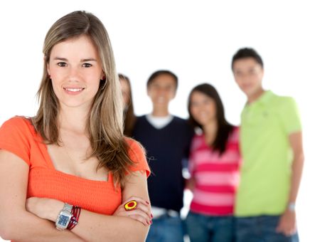 Woman with a group of people behind - isolated over a white background