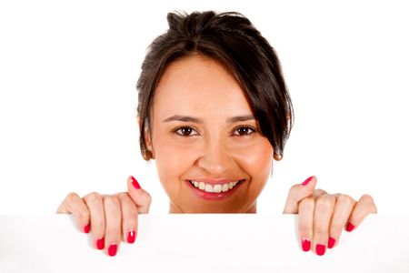 Woman holding a banner ad - isolated over a white background
