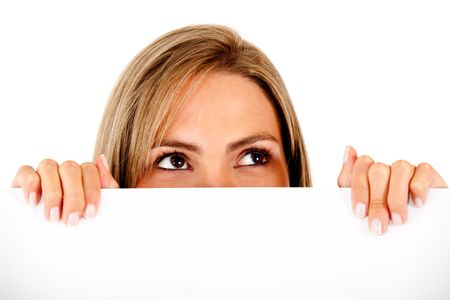 Woman holding a banner ad - isolated over a white background