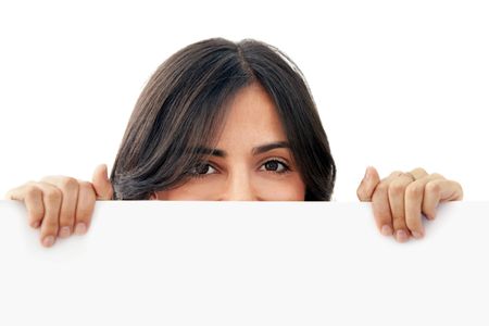 Woman holding a banner isolated over a white background