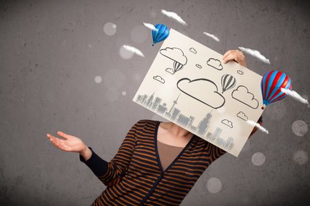 Woman holding a cardboard in front of her head with cityscape and ballons drawing