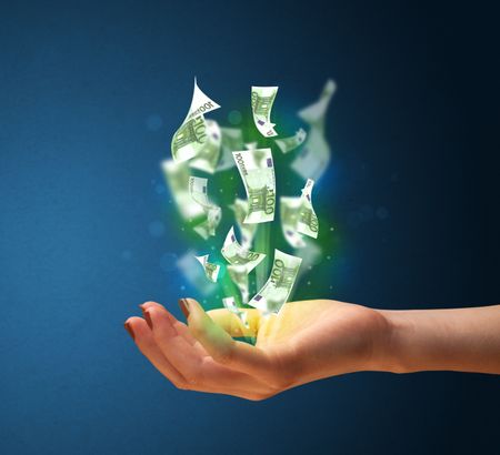 Woman holding glowing paper moneys in her hand