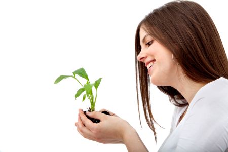 Woman holding a plant isolated over a white background