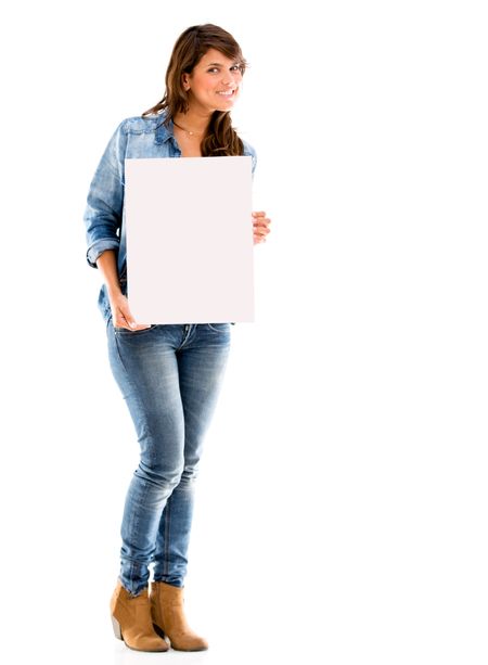 Woman holding a poster - isolated over a white background