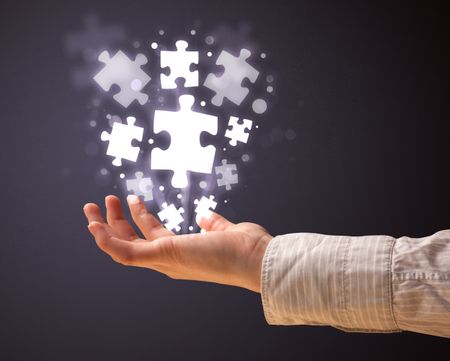 Woman holding shining puzzle pieces in her hand