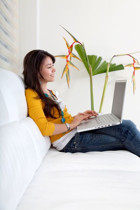 Woman at home sitting on the sofa with a laptop